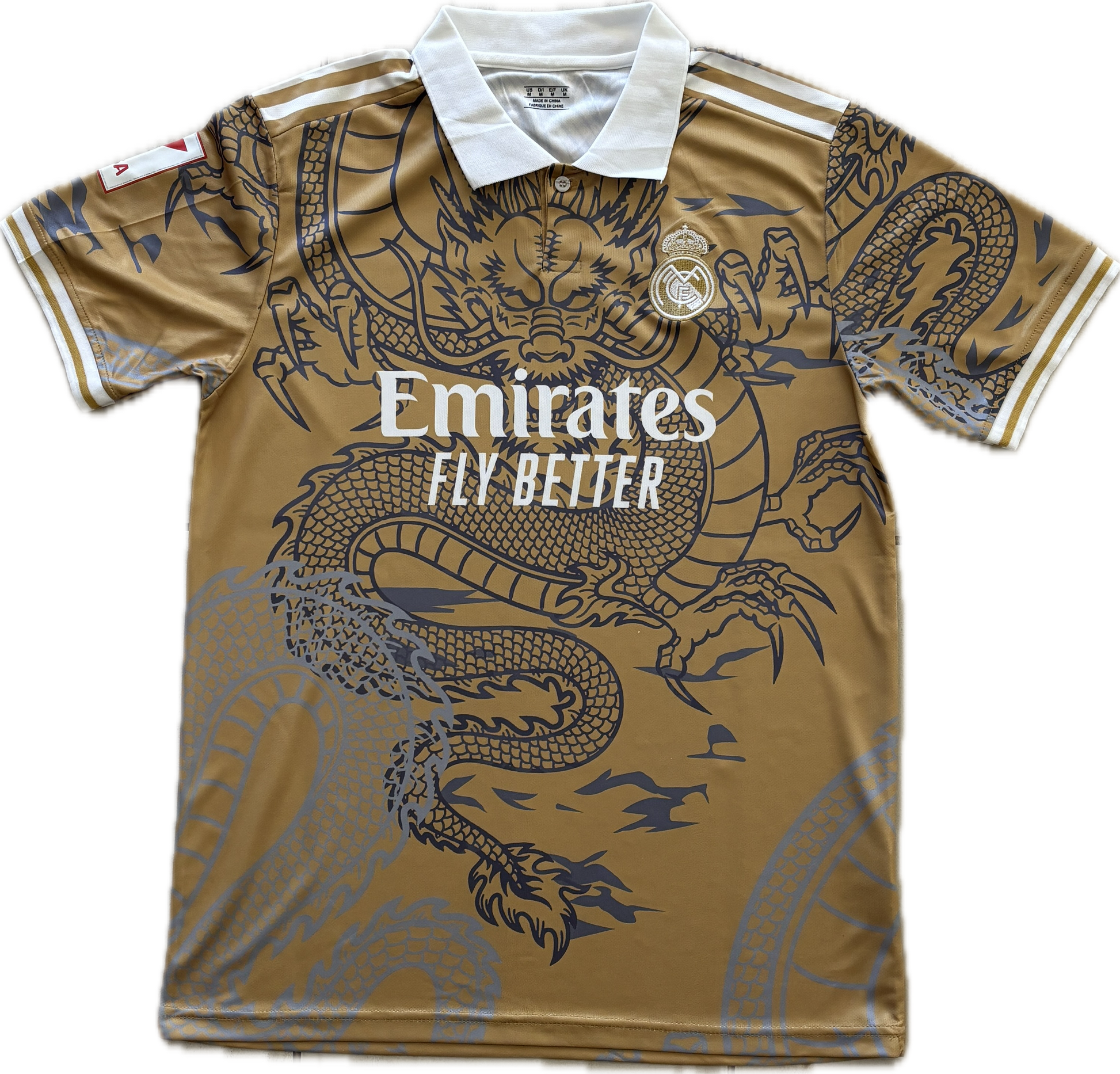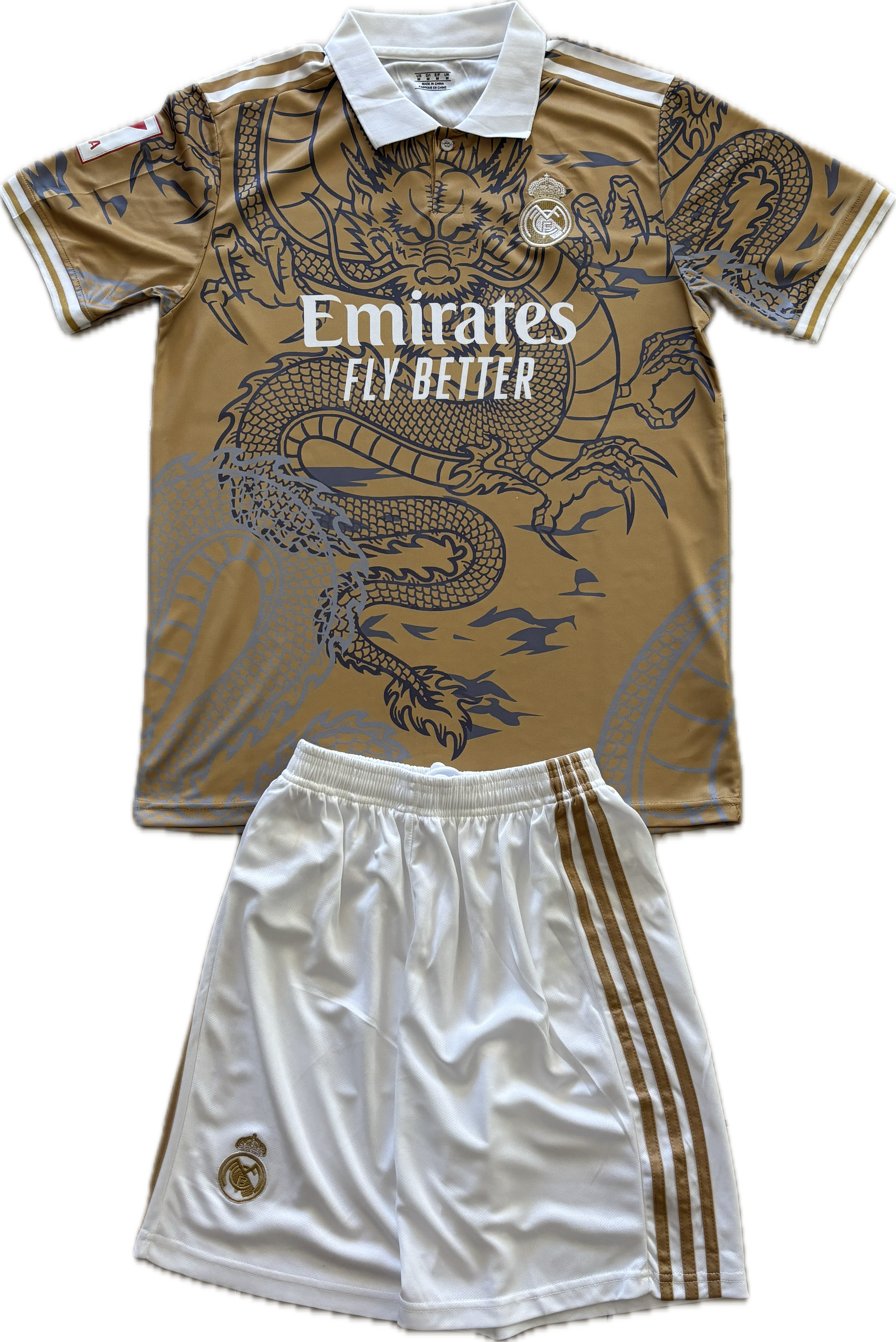 The jersey features a gold base with a large, detailed East Asian-style dragon graphic in a contrasting grey. It's paired with classic white shorts accented with matching gold stripes. Made from lightweight and breathable fabric, this fan kit is perfect for kickabouts, watch parties, or simply standing out with a unique piece of fan apparel.