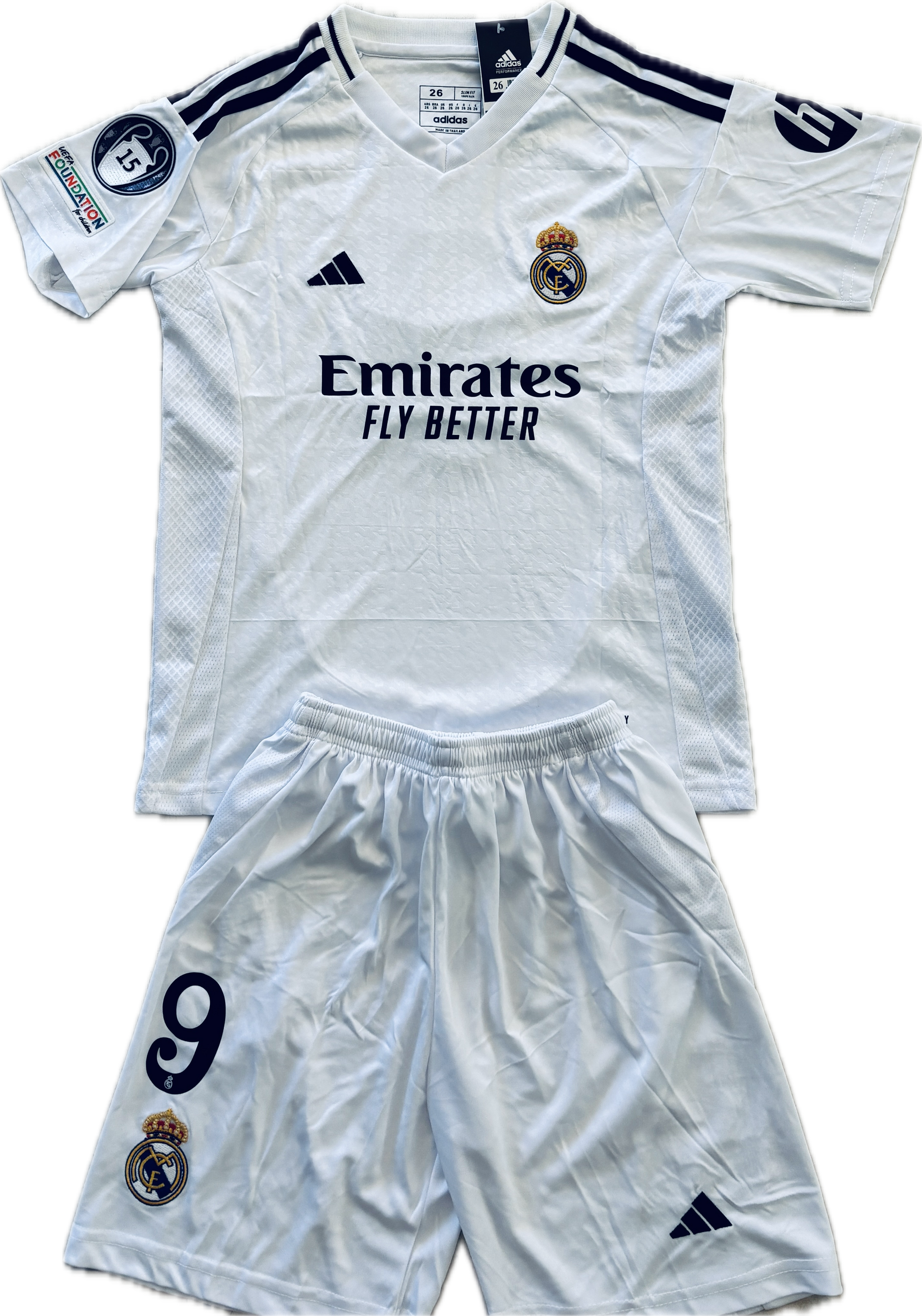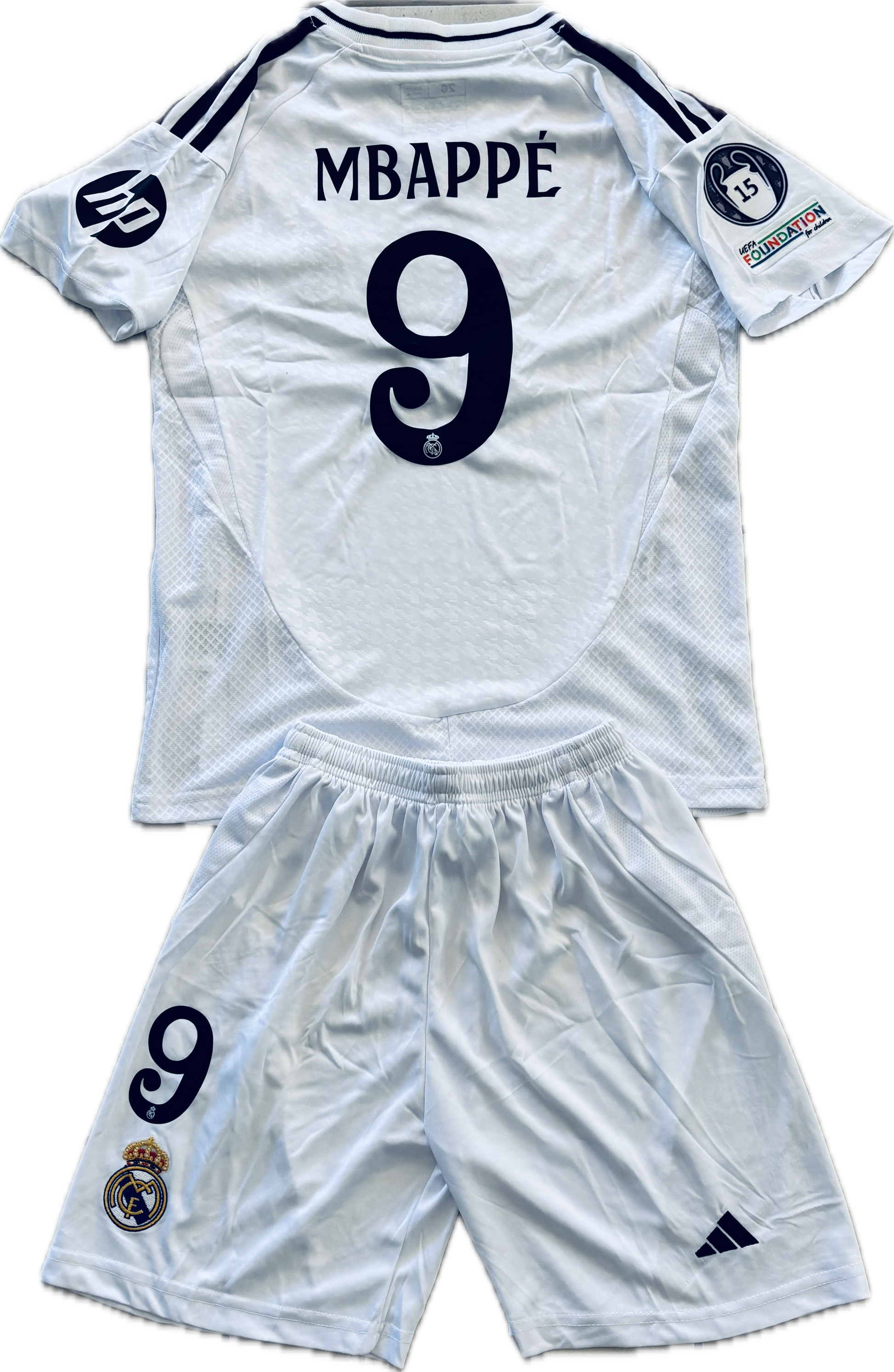 Kylian Mbappe 9 Real Madrid 2023/24 Home YOUTH KIDS ADIDAS Jersey 15 champions league White UCL champions league Soccer jersey