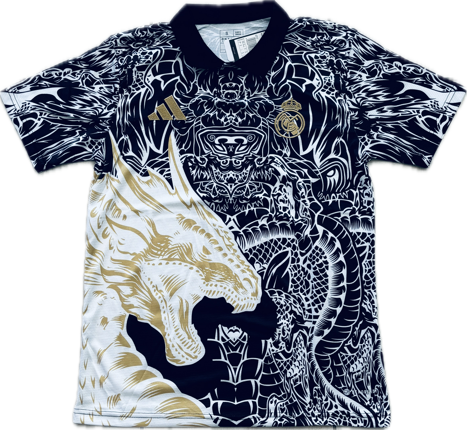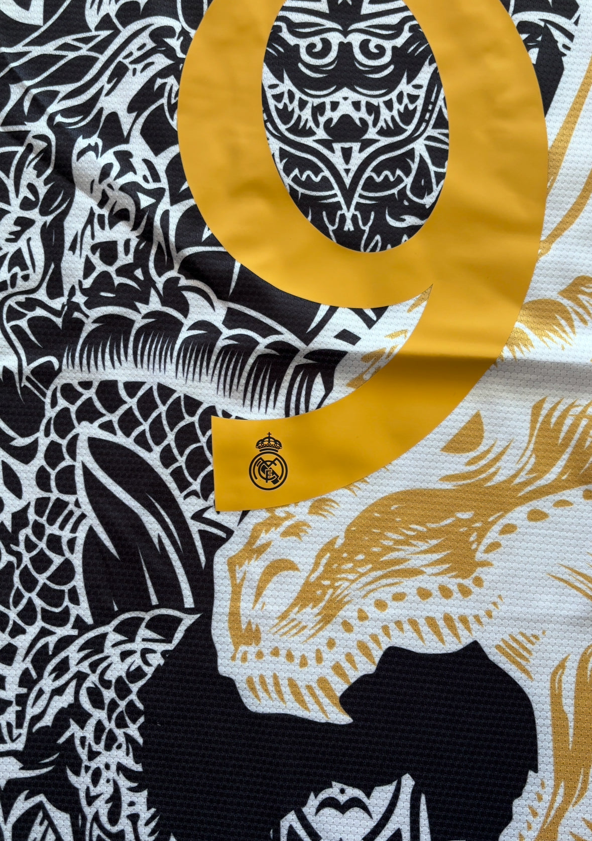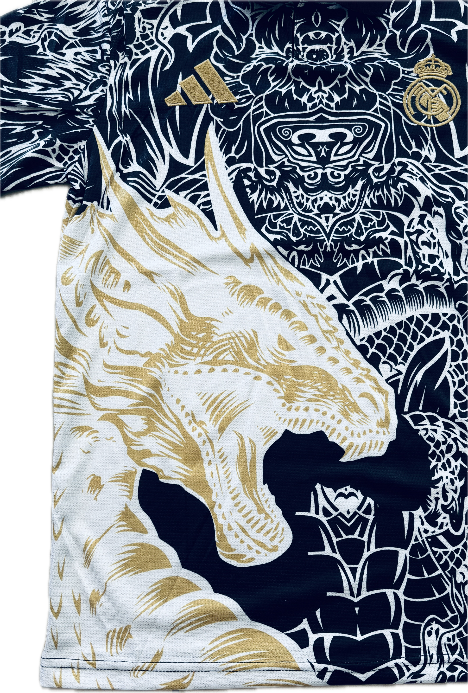 Kylian Mbappe Real Madrid 2023/24 Gold Dragon jersey inspired by the Asian art and design similar to the Tokyo Ronaldo shirt designed in 2014 Black Yamamoto Jersey