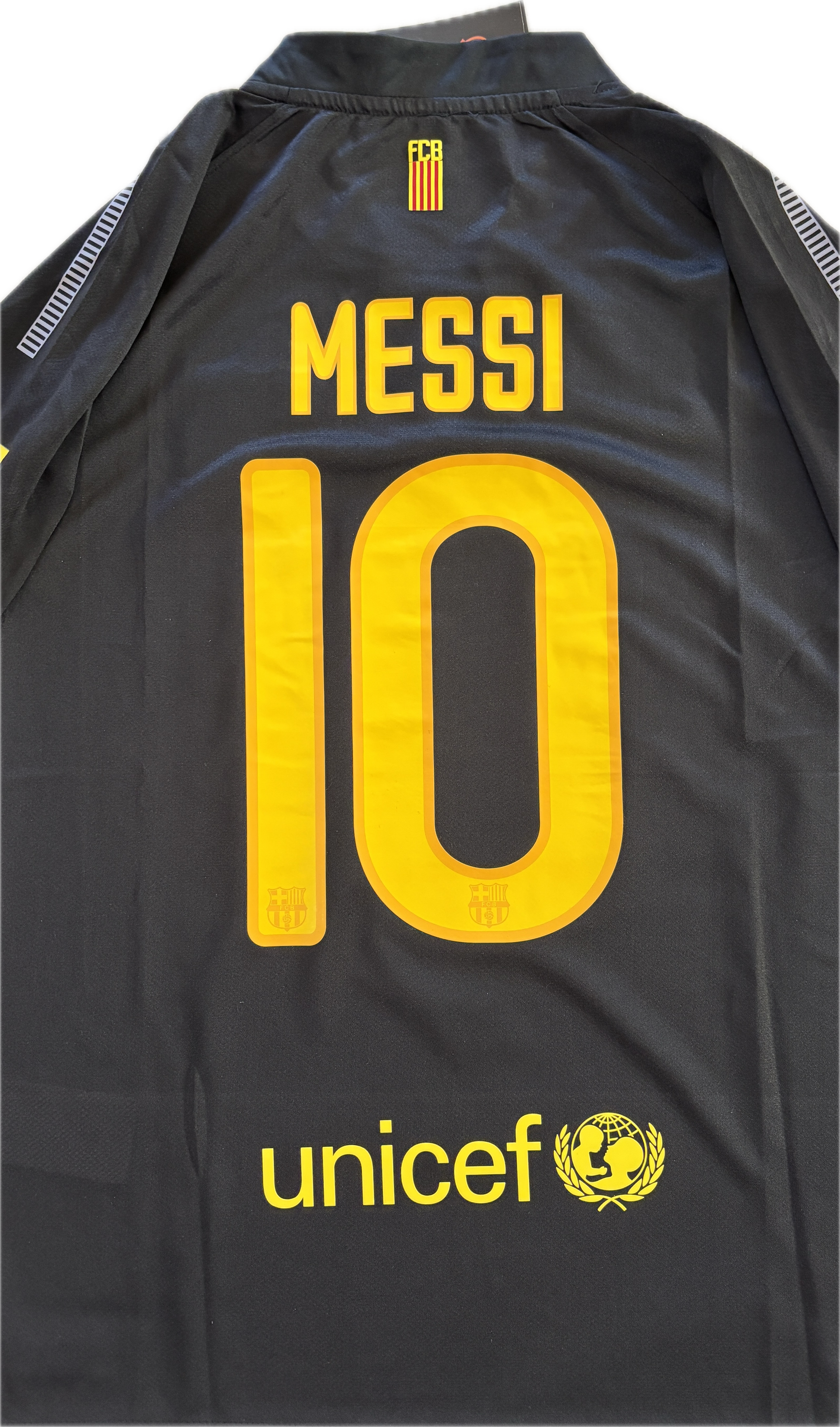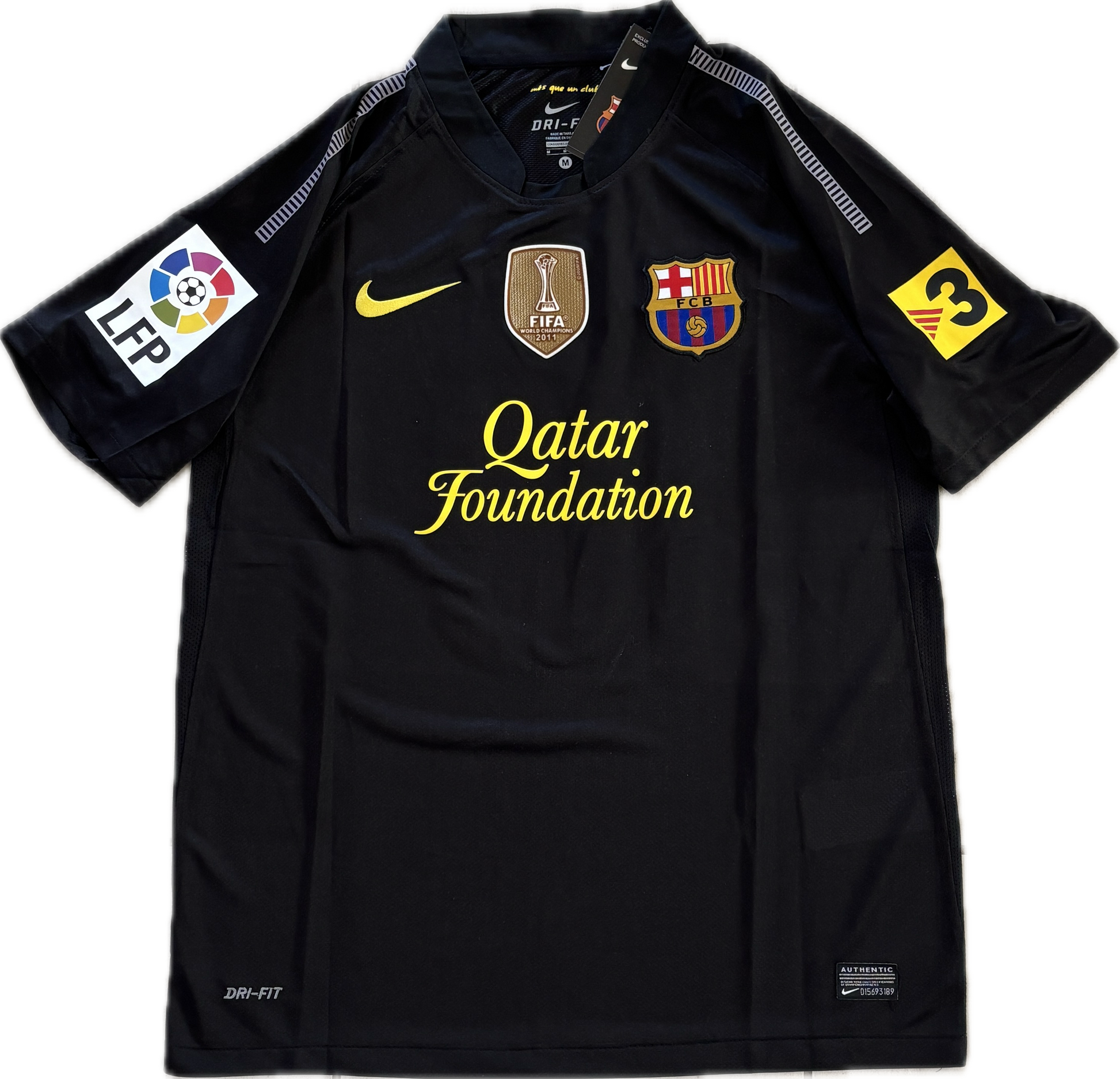 This is the legendary Nike FC Barcelona away jersey from the historic 2011-2012 season, featuring the legendary Lionel Messi and his #10. The sleek black design is fully adorned with all the patches from that year.