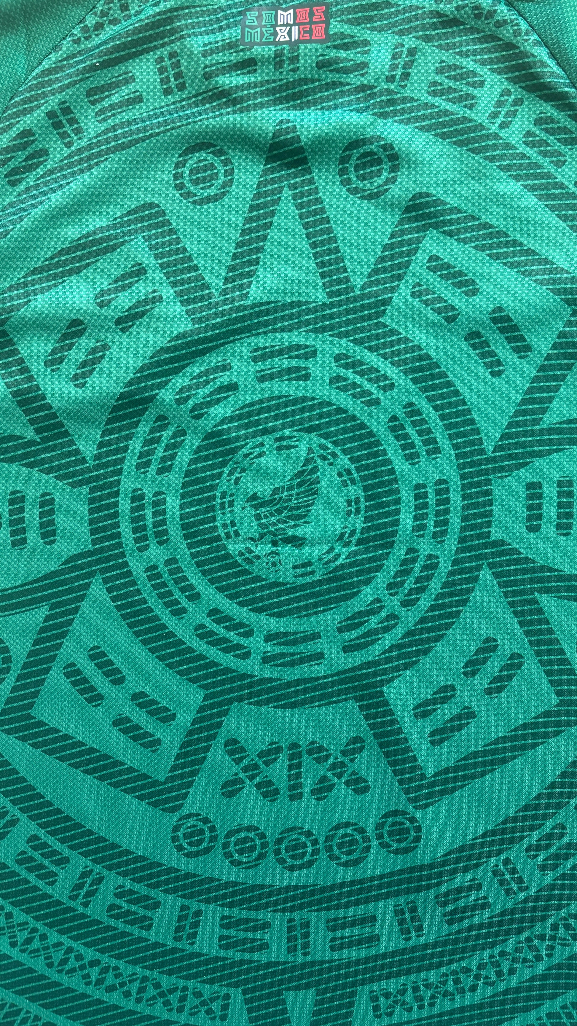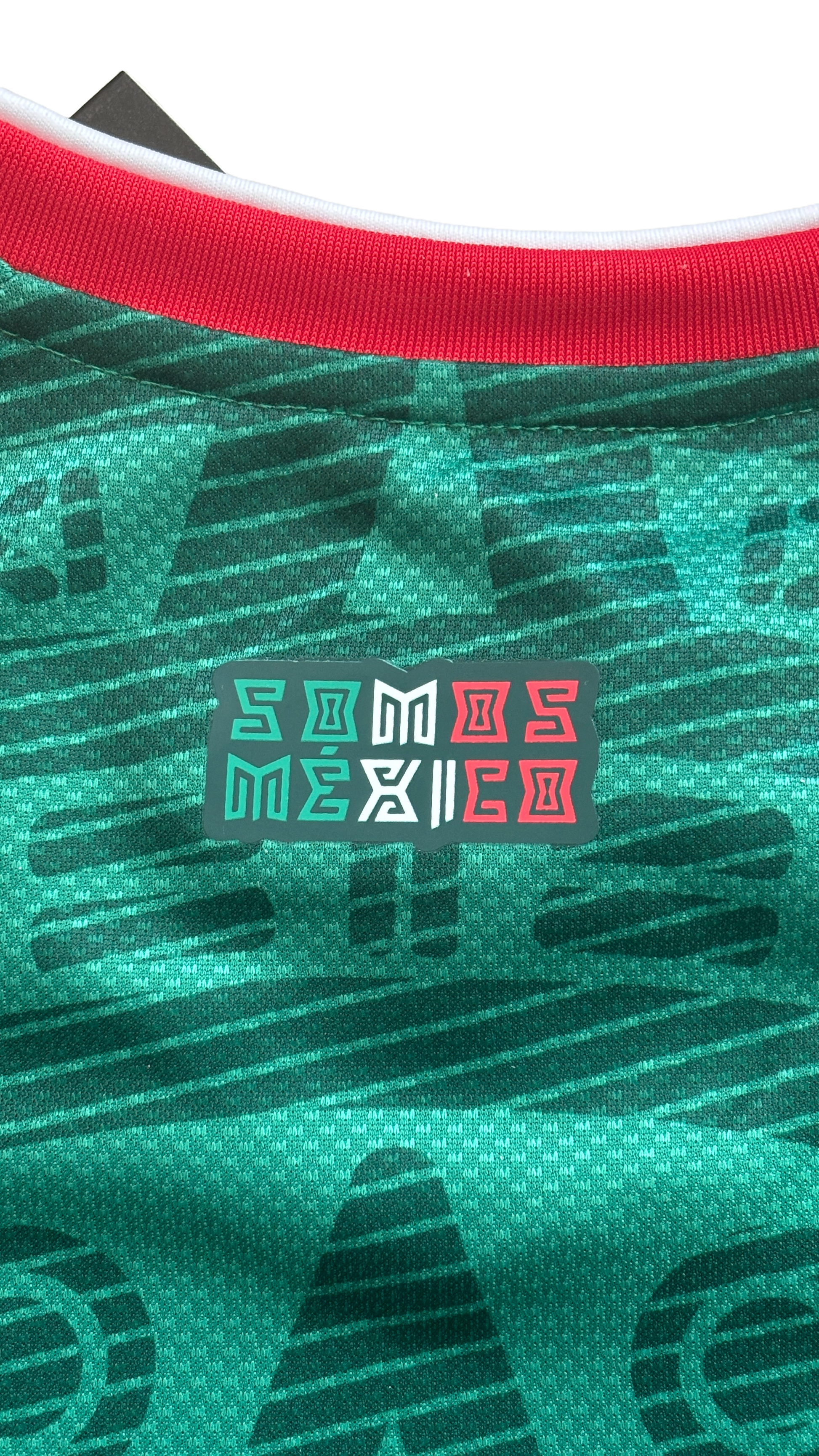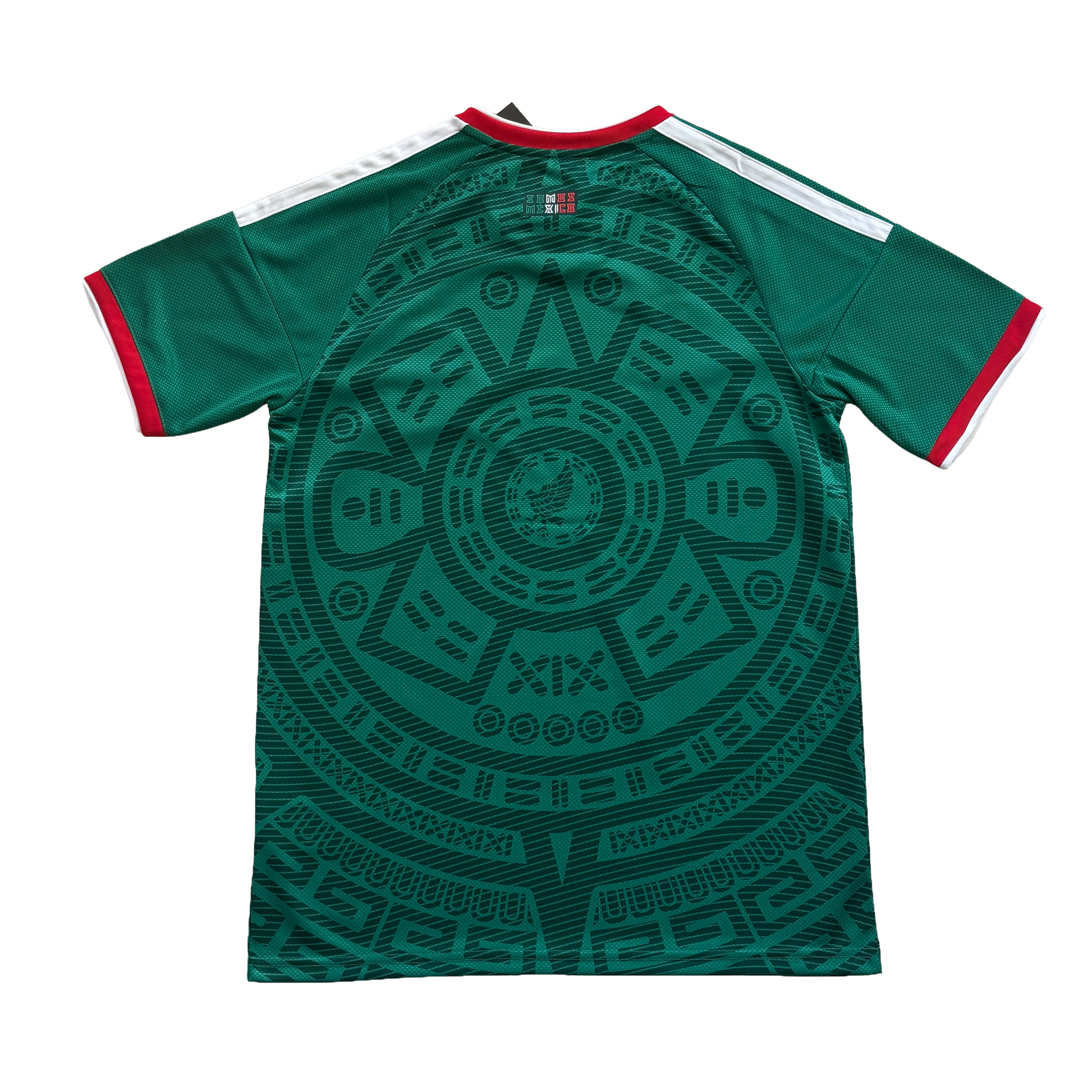 DESIGN INSPIRED BY ANCESTORS The vibrant "Bold Green" base is accented with traditional red and white trim on the V-neck collar and sleeve cuffs. The modern Mexico National Team crest is centered within the sun stone design, symbolizing the fusion of ancient culture and the new era of Mexican football.